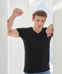 Feel good men's stretch t-shirt with enzyme wash for unique soft hand-feel. 96% cotton, 4% elastane for improved fit, comfort and shape retention. Modern long-line fit. V-neck with back neck binding and soft stretchy rib neckline. Features new tearable removable label.